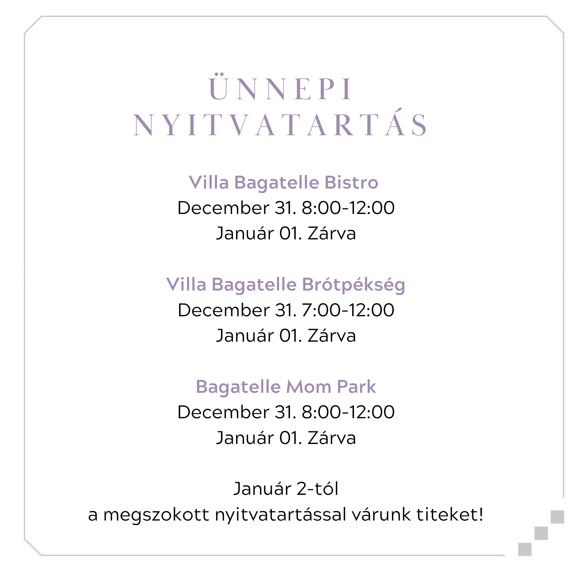 A Brótpékség finomságait tavasztól őszig a Villa Bagatelle napsütötte kertjében is elfogyaszthatja. Miután pékségünkben megvásárolta kedvenc szendvicsét, süteményét, kávéját, foglaljon helyet napernyőink alatt. Kertünkben februártól novemberig folyamatosan virágzik valami, így mindig más arcát mutatja meg. Míg Ön a friss levegőt és a meleg napsütést élvezi, gyermekei is megtalálják majd a nekik való elfoglaltságot: kenyeret süthetnek csigapékségünkben, megkevergethetik óriás kávéscsészénket, vagy épp meghódíthatják favárunkat.